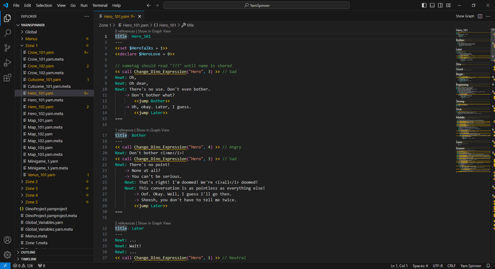 Below is an example of the game dialogue, which was mainly written in the YarnSpinner scripting language.