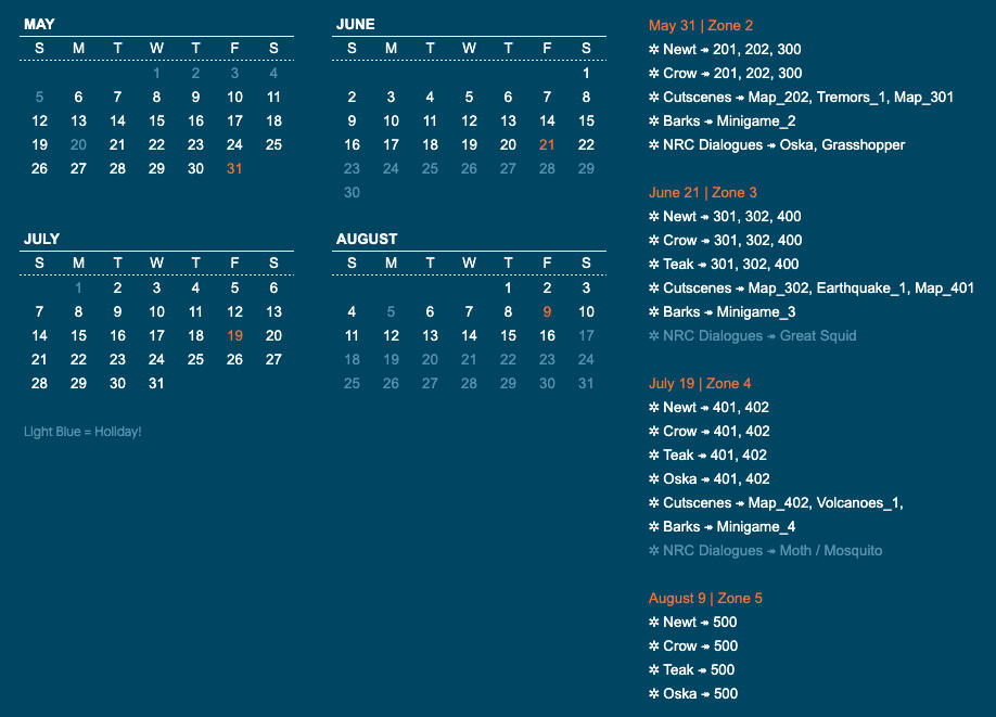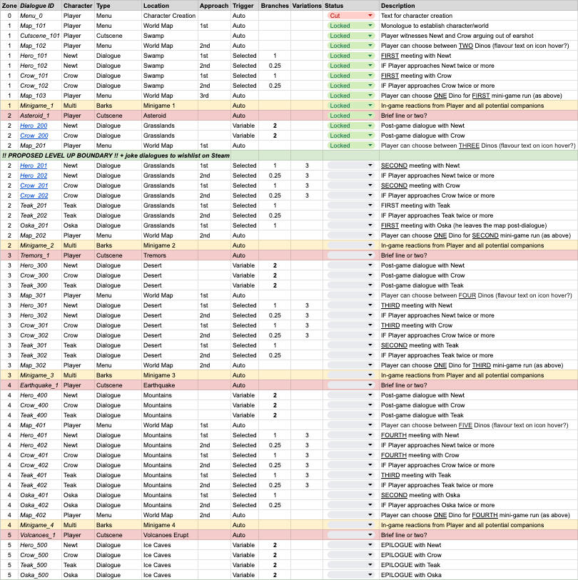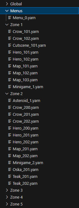 I built out the structure of the narrative so that our programmers could begin to implement dialogue files where needed; the actual written text of the game could then be updated without requiring any major structural changes.
